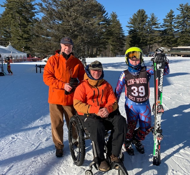 So when I saw Geoff through some trees on another trail doing what he loves most– skiing, talking about skiing, and helping others (regardless of their mobility) be better skiers, my heart swelled with pride. And when he talks about skiing with our kids, who are developing ski racers, having been black diamond skiers for years at this point like their dad, they listen. But working in the ski industry, he doesn’t often get to watch their races or freestyle experiences. So when he was presented with an open Thursday, free from work or clinics, he traveled over to Cranmore with his own dad, Phil, who is 81 years old, to watch our sixth-grader in his first, middle school ski team race. Phil still takes a few runs at Cannon and Bretton Woods from time to time when the conditions are perfect– he doesn’t like the powder or ice anymore at 81, which is understandable.