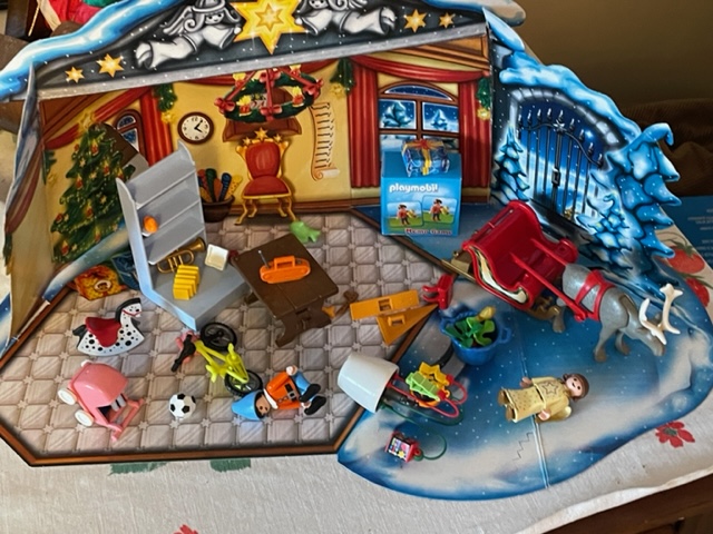 Clearly the Playmobil (correct spelling) advent calendar has been bumped recently, but as I looked at it this morning, trying not to laugh, I realized how much it is indeed a true reflection of life leading up to the holidays. From the carriage knocked over on its side to the angel looking like she is waiting for a return trip to heaven to the elf maybe having stayed up too late– or had too much eggnog with the angel. Maybe the music from the orange radio on the brown table got a little crazy last night in the advent workshop. At least Santa’s sleigh appears to be in good shape already hooked up to the reindeer and just waiting patiently for Santa to show up a little bit later in the advent schedule.
